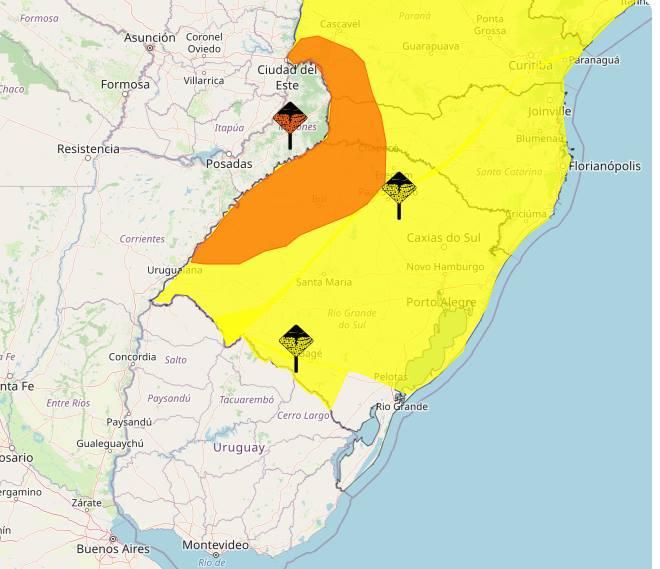 Uma área de baixa pressão interage com a massa de ar quente sobre o Rio Grande do Sul e provoca chuva e temporais isolados em todas as regiões do estado nesta sexta-feira (24). Os temporais podem ser intensos, com risco de vendavais e queda de granizo, o que pode causar danos e interrupções no fornecimento de energia elétrica.